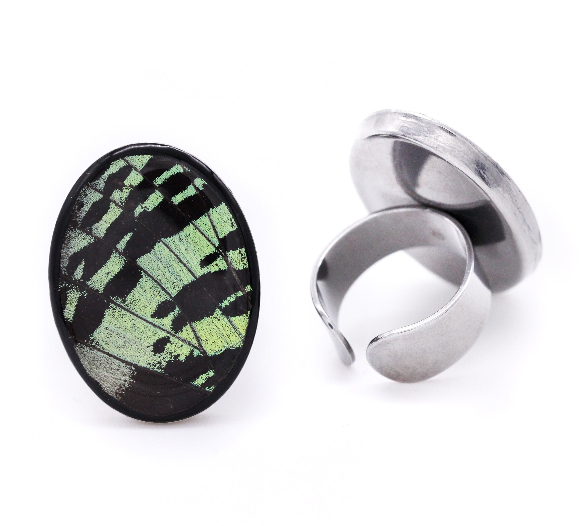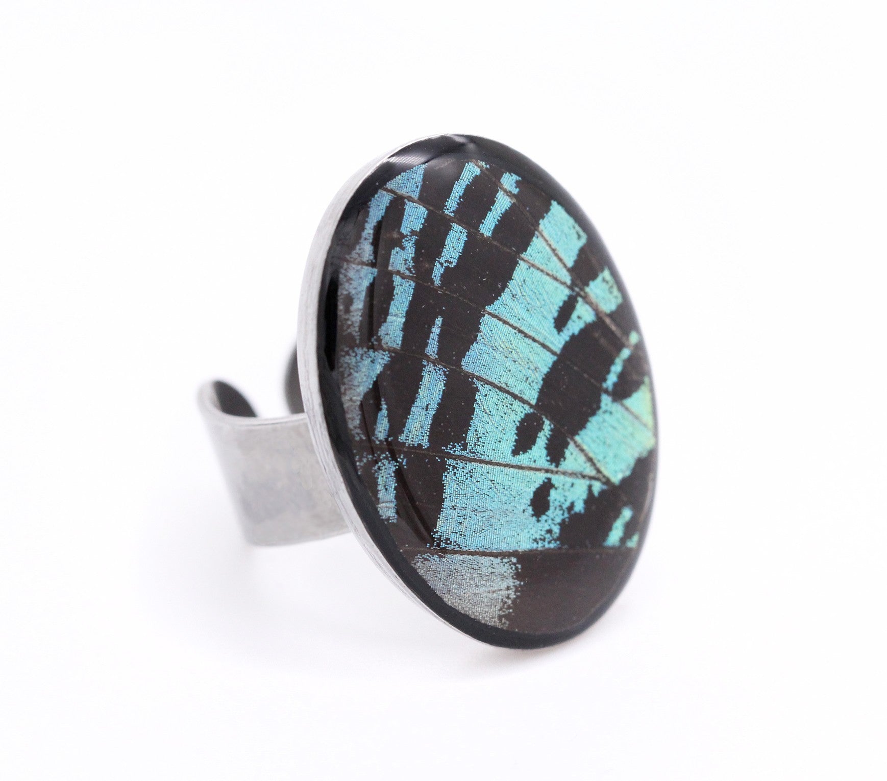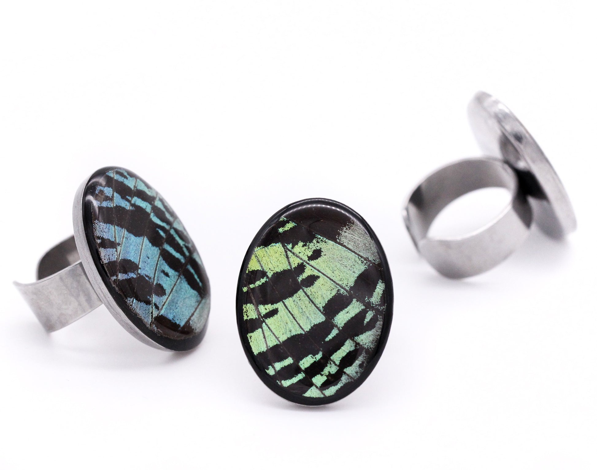 Anillo elaborado en acero quirúrgico con alas de la especie Urania ripheus de Madagascar.