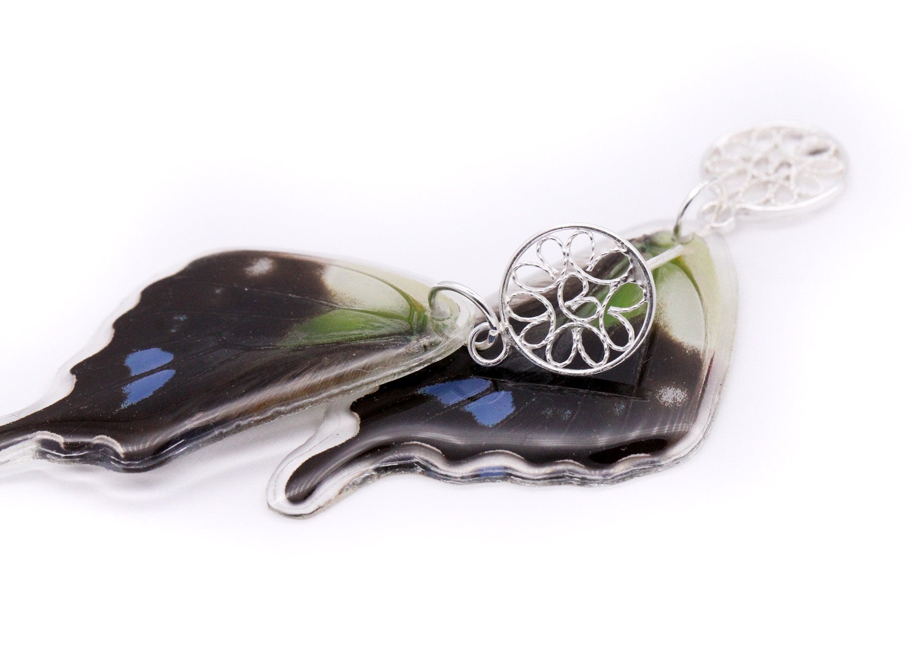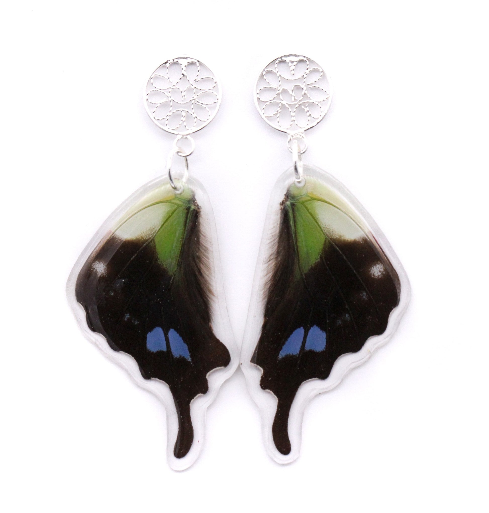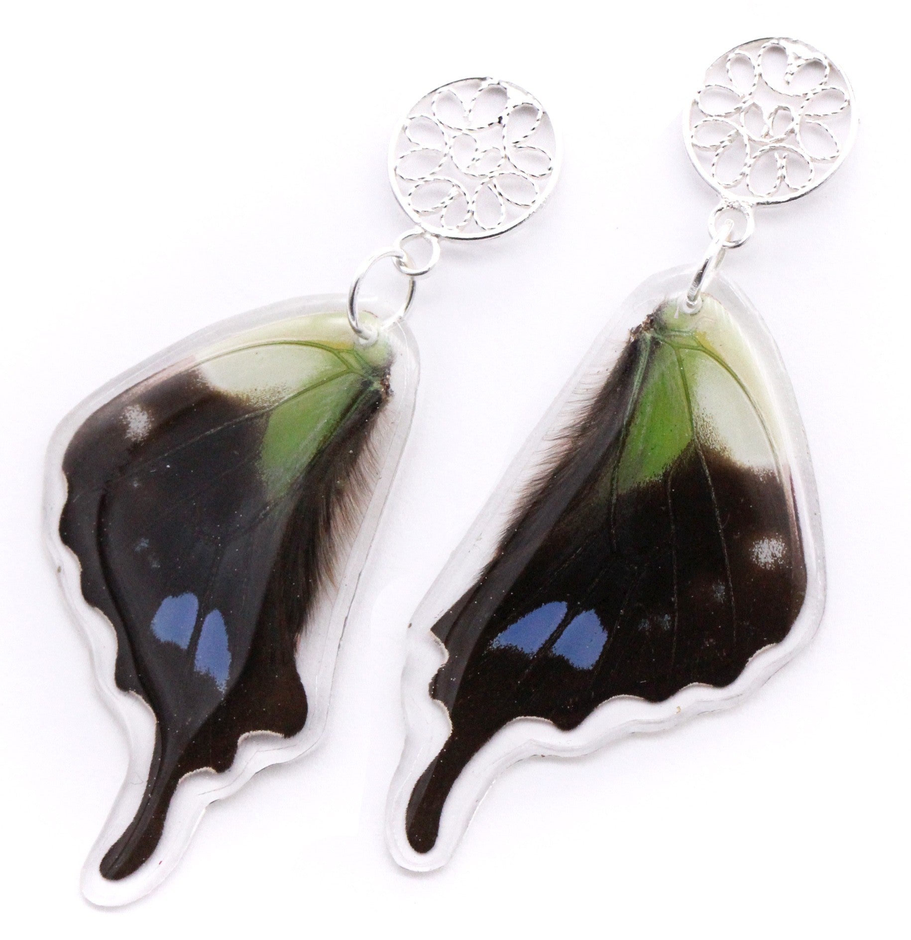 Aretes elaborados con alas de la mariposa Graphium weiskei del sureste asiático y topo de filigrana en plata 925.