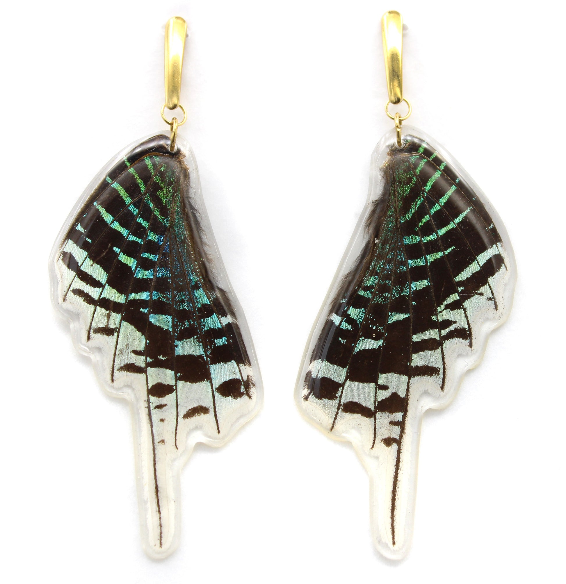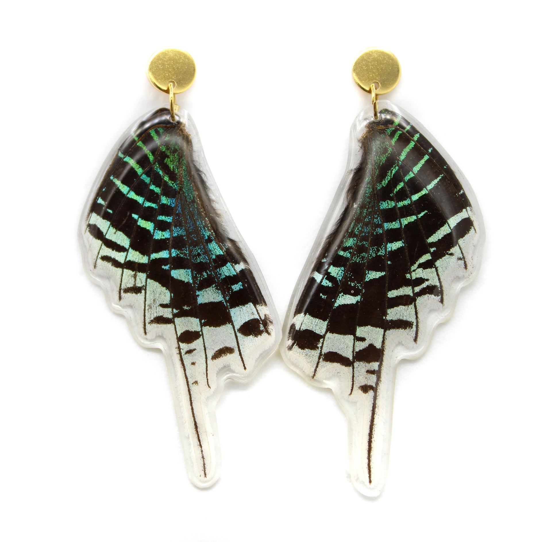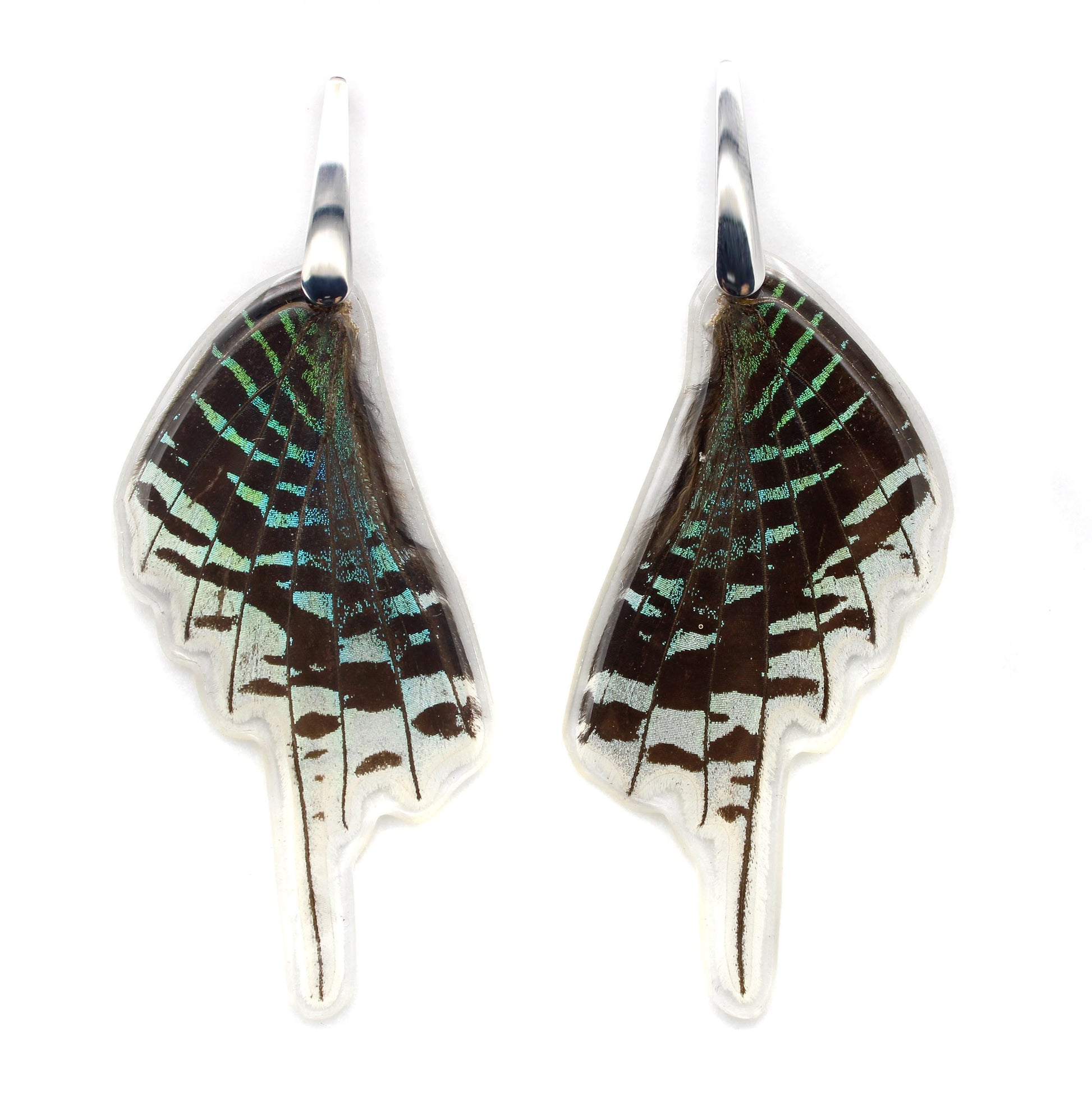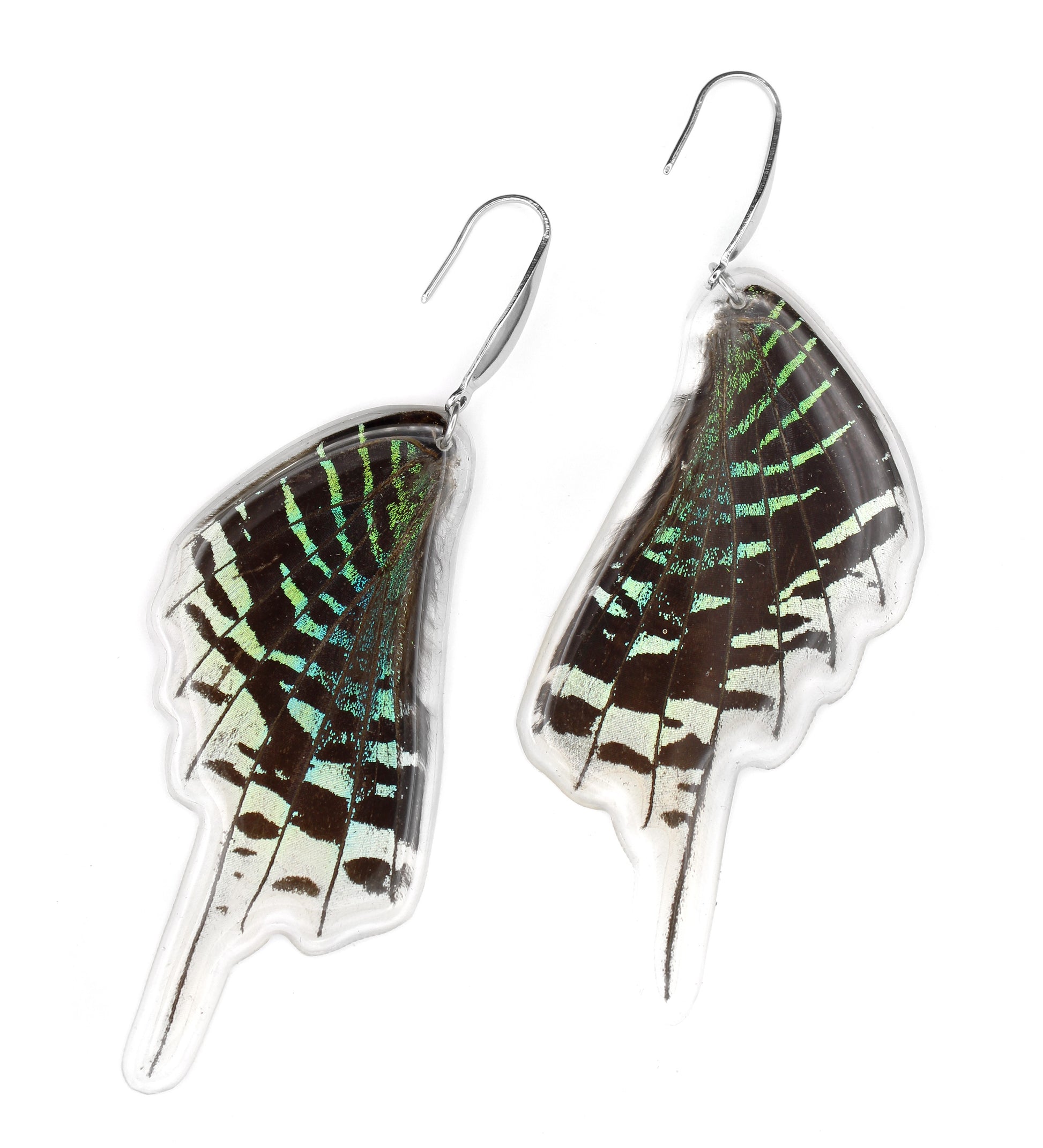 Aretes elaborados con alas de la especie Urania leilus y herraje hipoalergénico de acero.