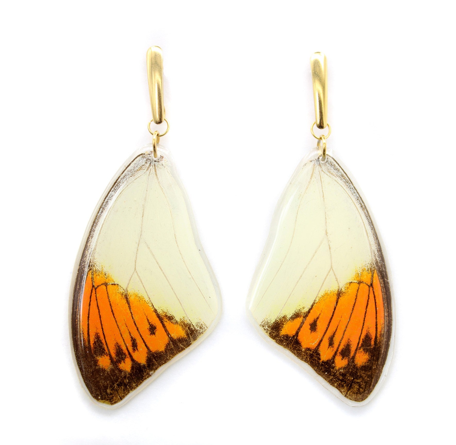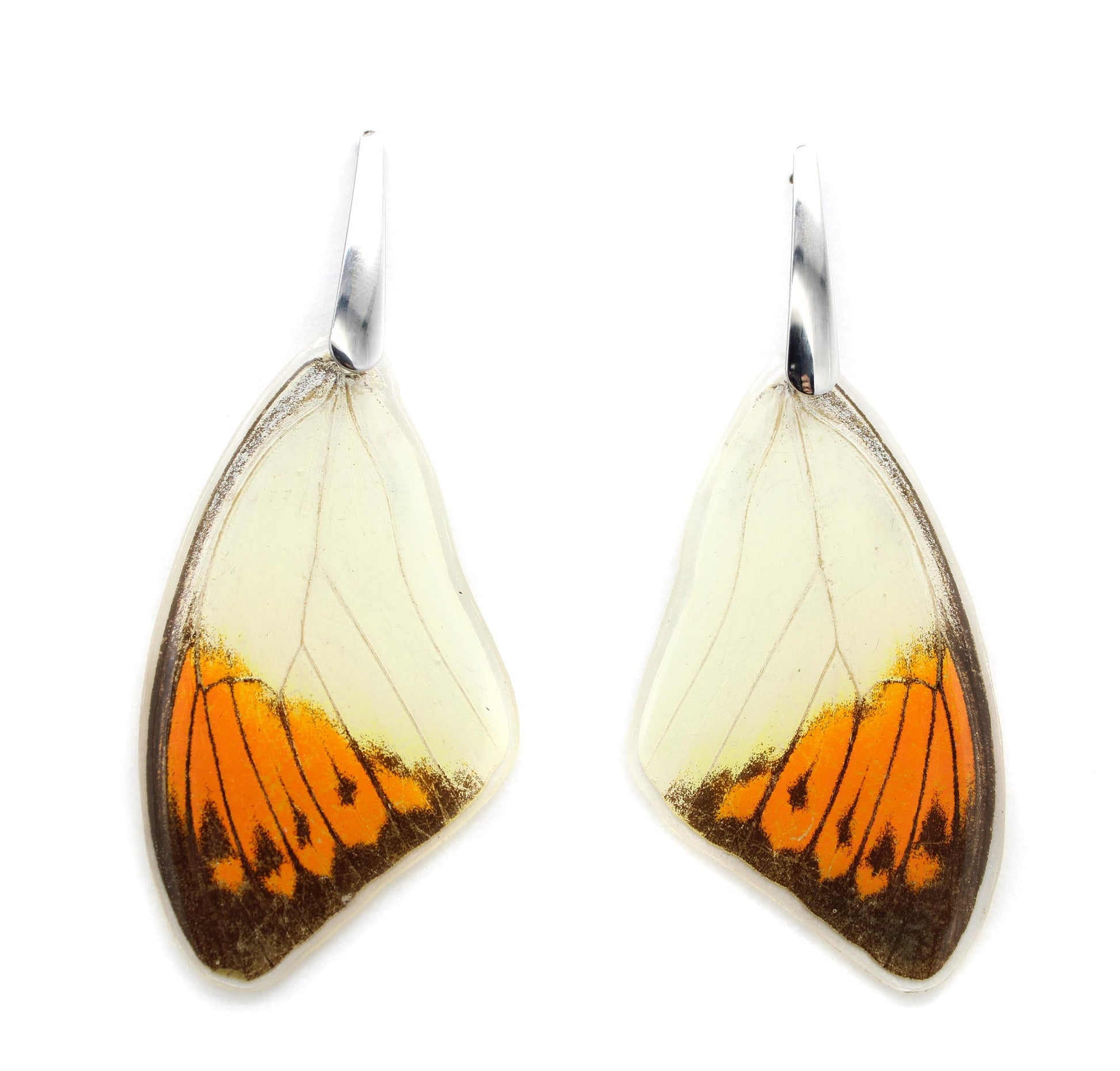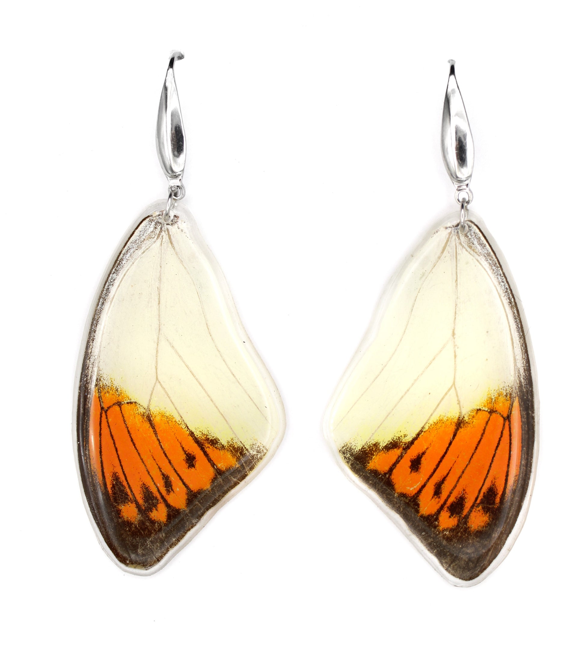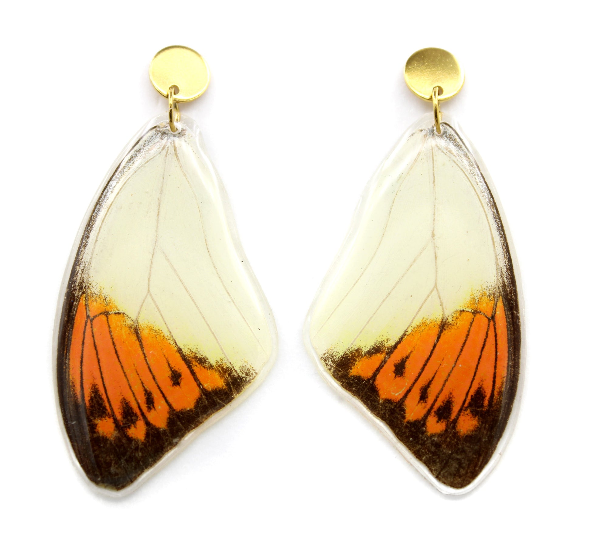 Aretes elaborados con alas de la mariposa de sureste asiático Hebomoia glaucippe y herraje hipoalergénico de acero.