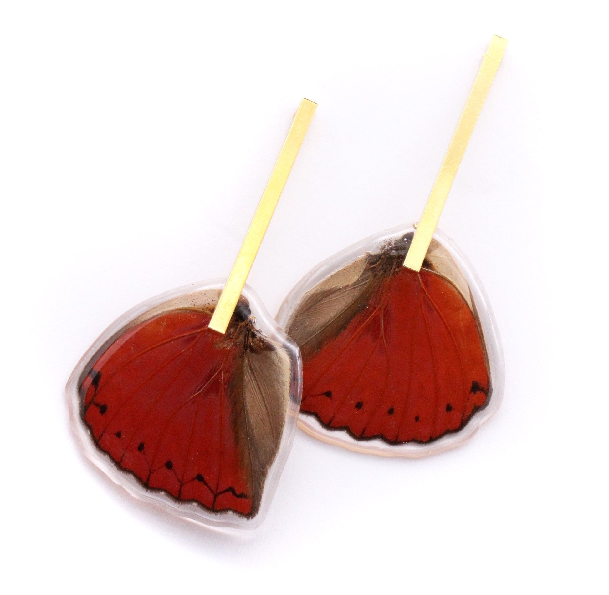 Aretes elaborados con alas de la mariposa roja Cimothoe sangaris y herraje de bronce con baño de oro de 14k.