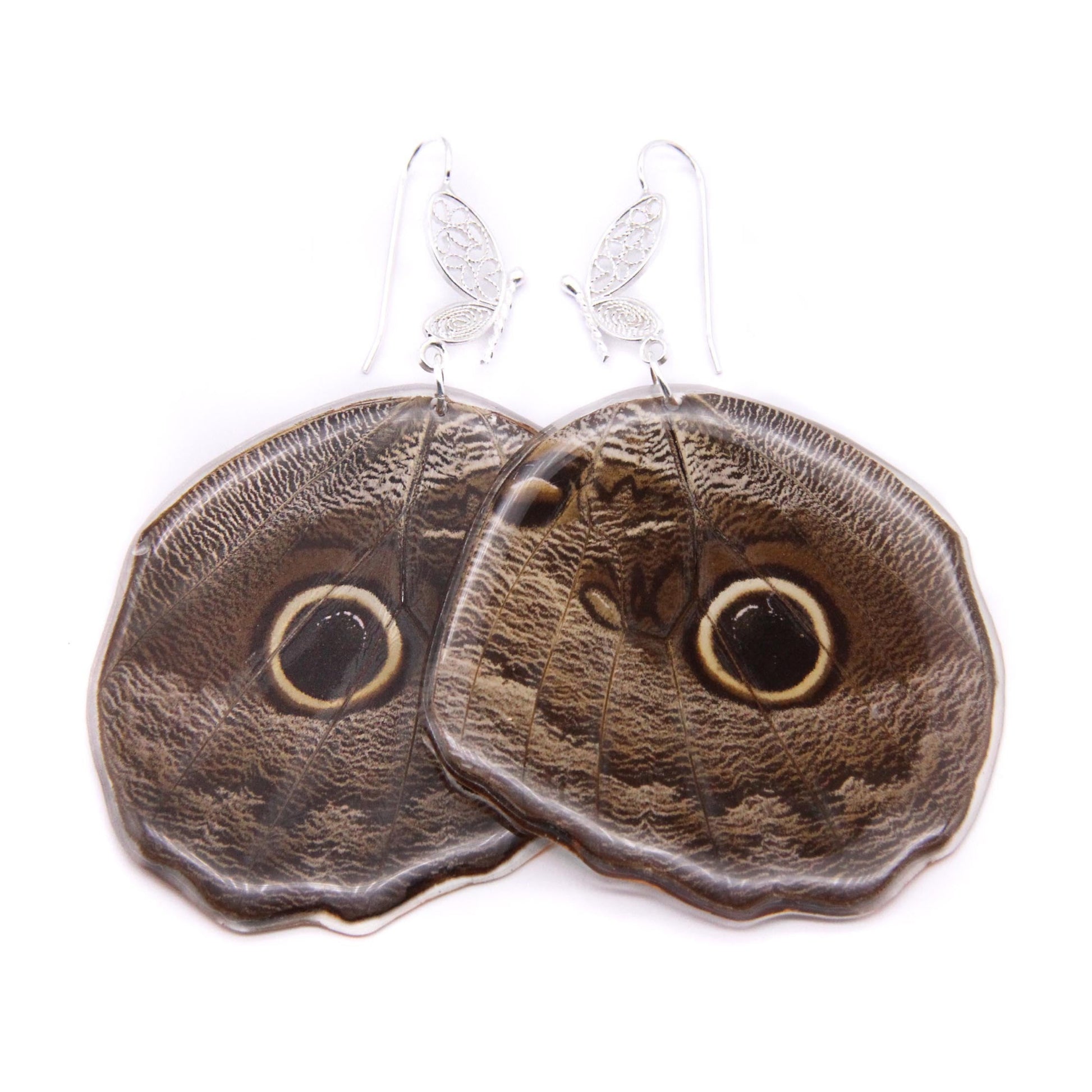 Aretes elaborados con alas de la mariposa búho y anzuelo de filigrana en plata 925.