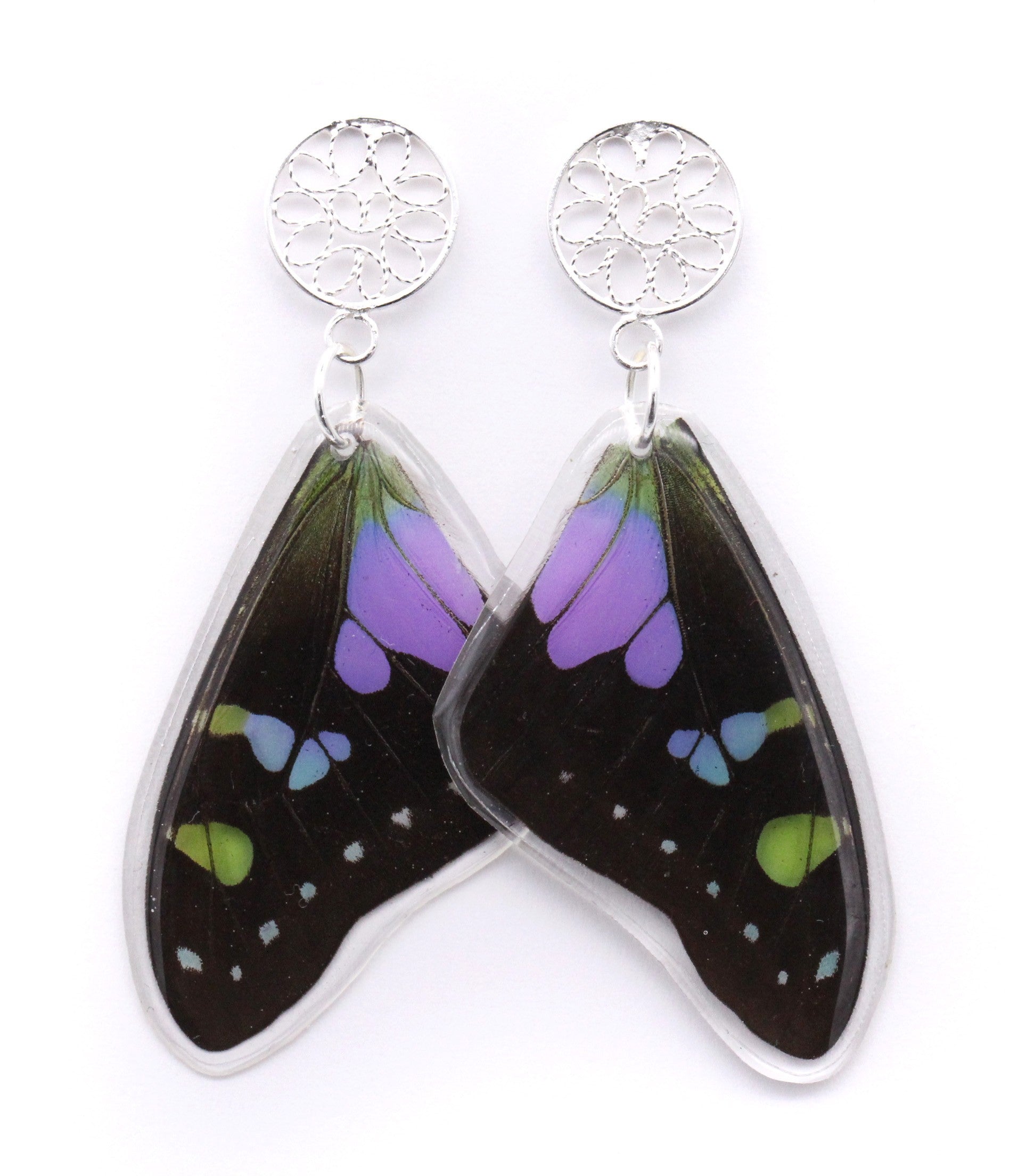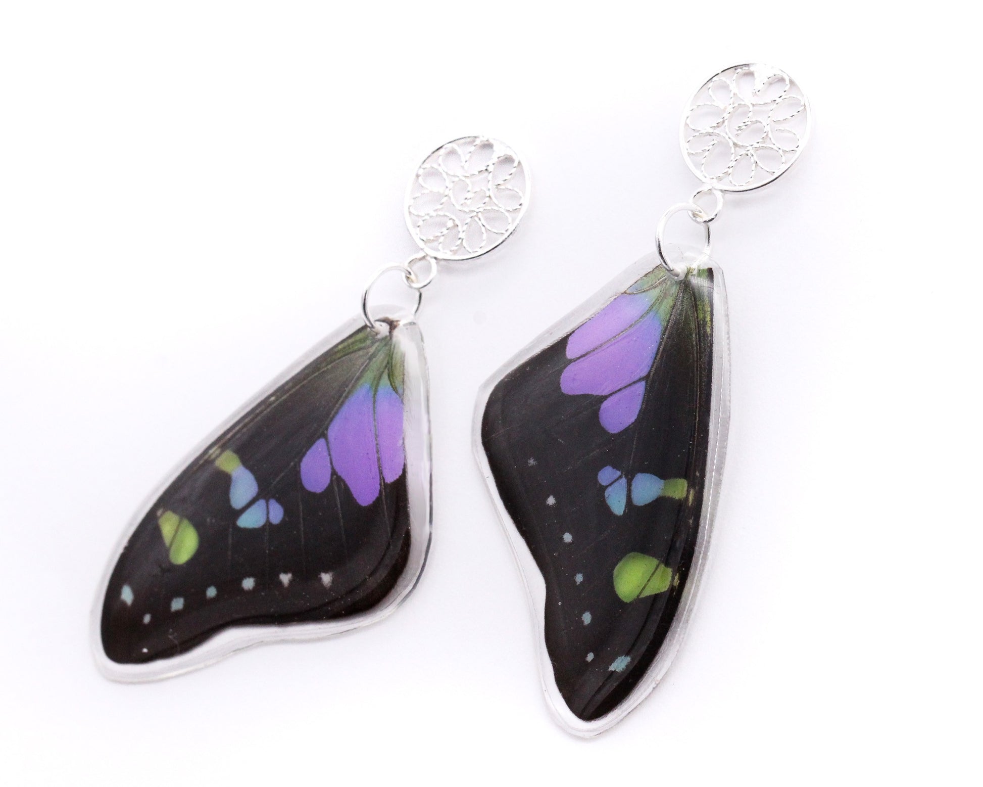 Aretes elaborados con alas de la mariposa Graphium weiskei y pin de filigrana en plata 925.