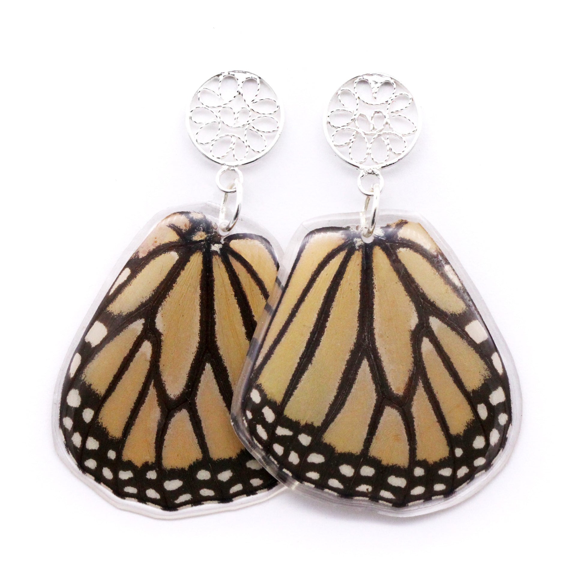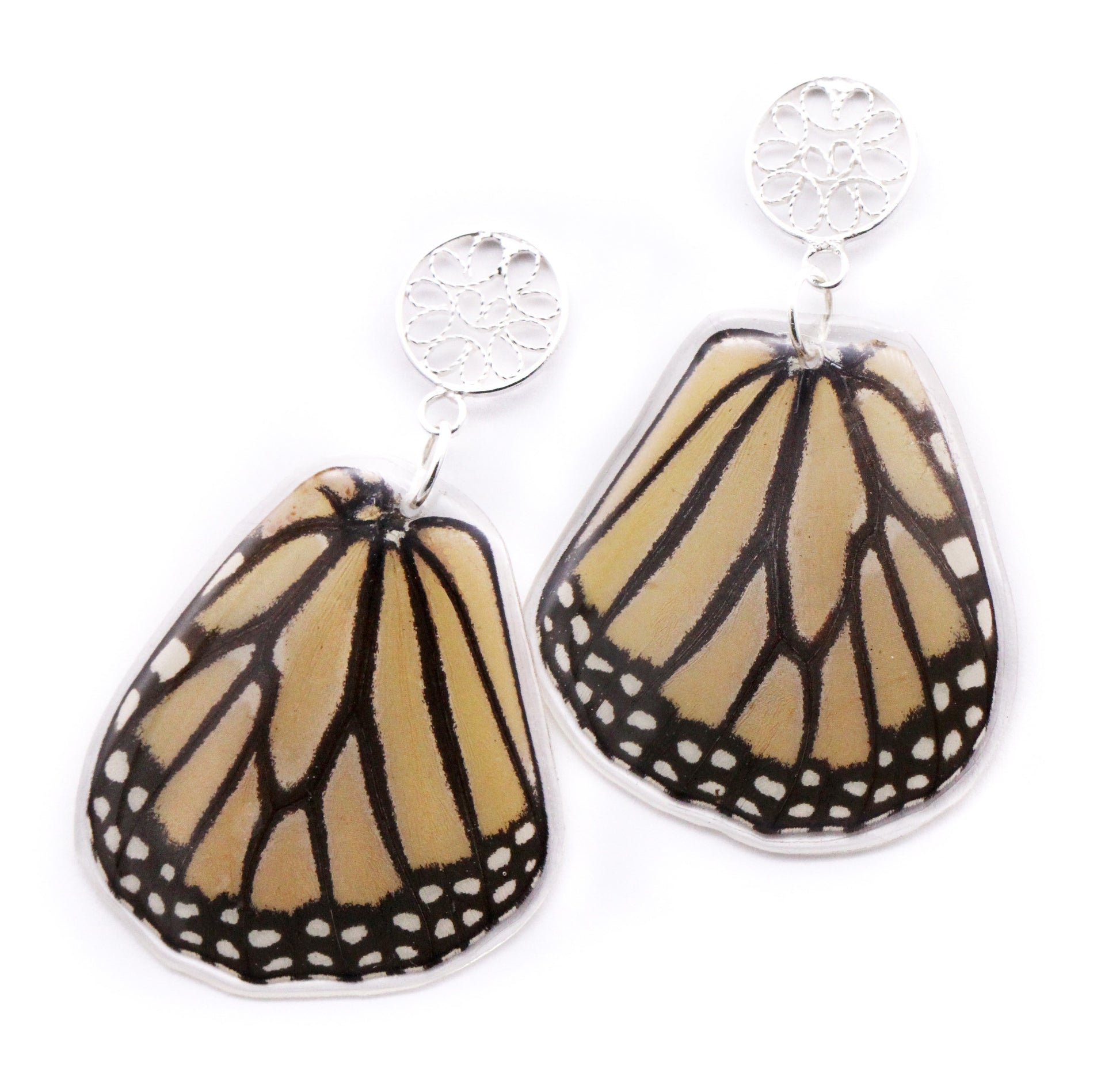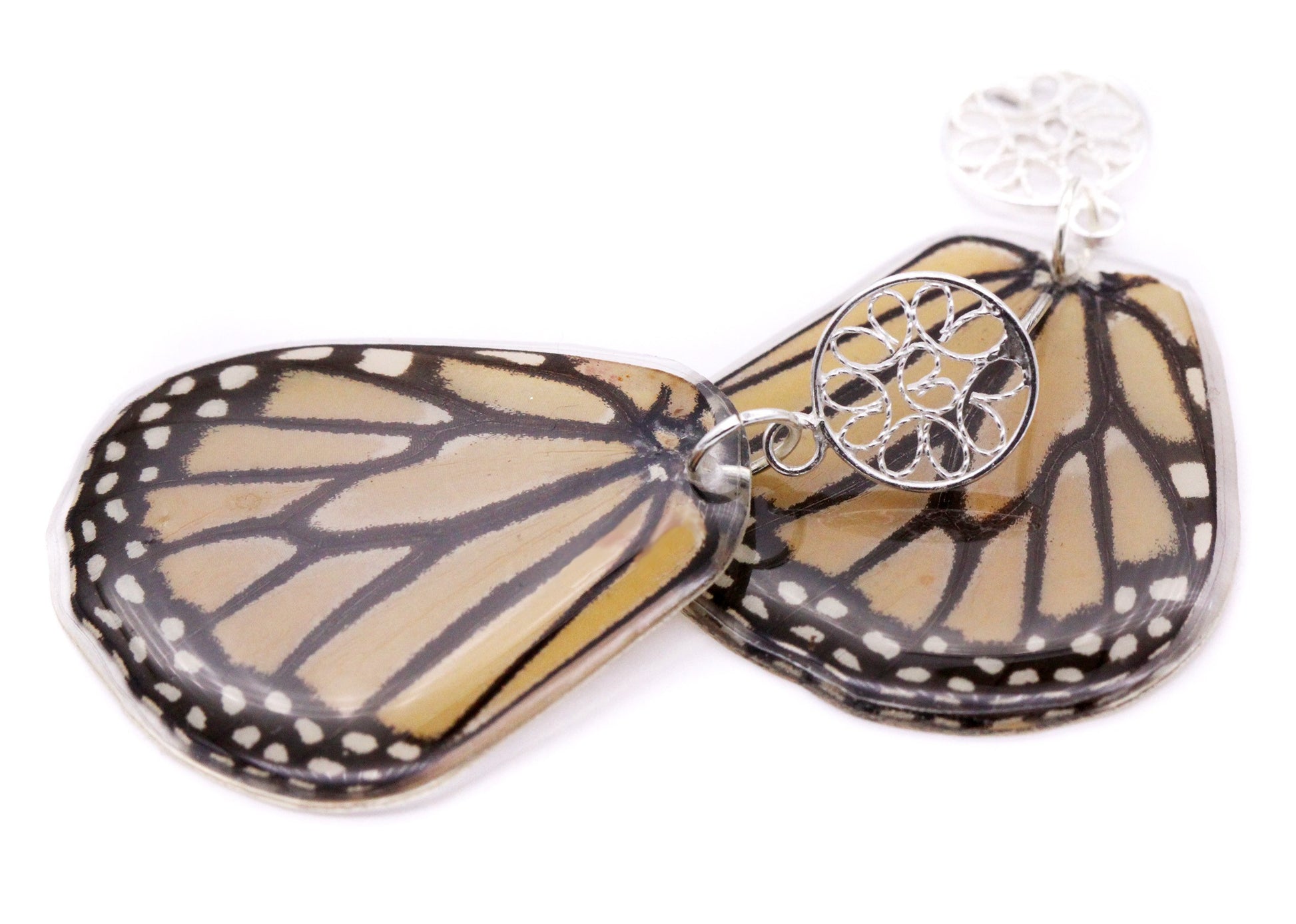 Aretes elaborados con alas de la mariposa Monarca Danaus plexippus y pin de filigrana en plata 925.