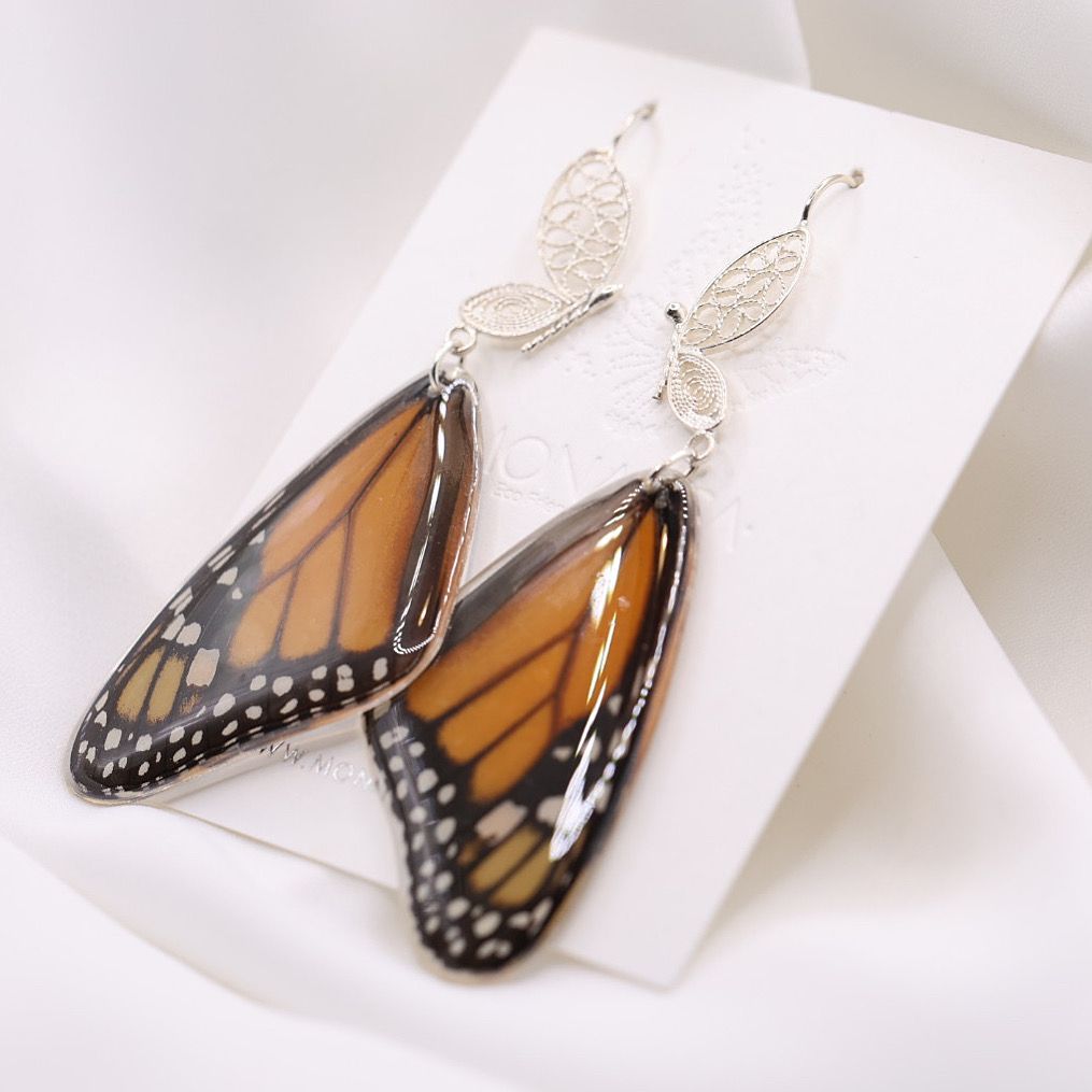 Aretes elaborados con alas superiores de la mariposa Monarca Danaus plexippus y herraje en filigrana de plata 925.