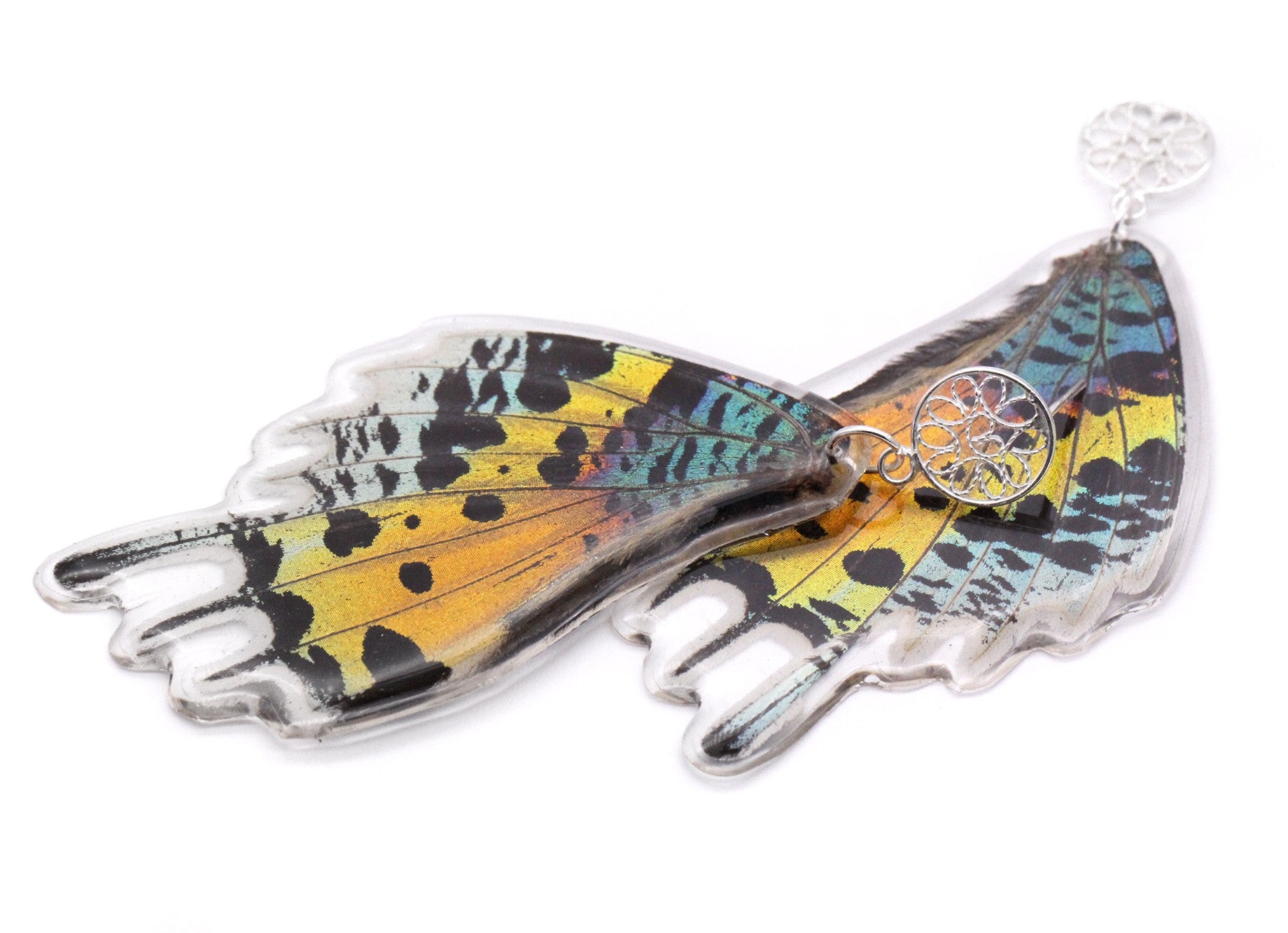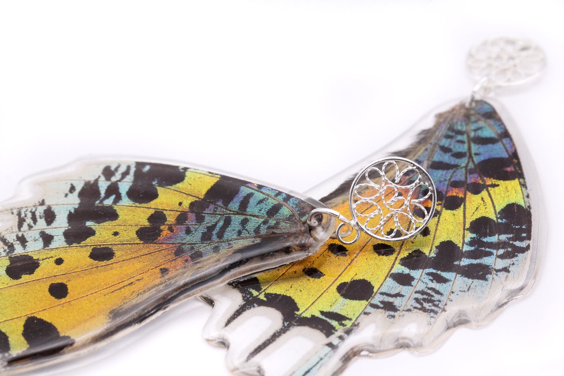 Aretes elaborados con alas de la especie Urania ripheus y pin de filigrana en plata 925.