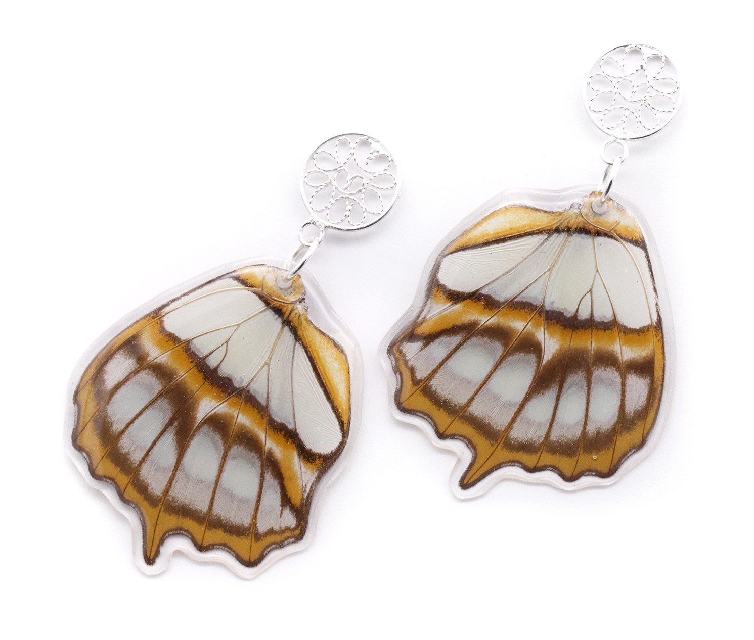 Aretes elaborados con alas de la mariposa Victorina stelenes y pin de filigrana en plata 925.
