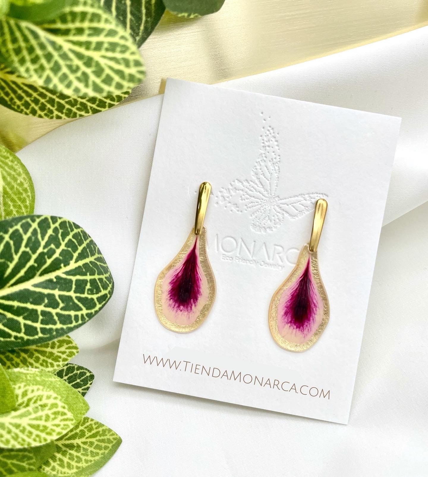 Aretes elaborados con pétalos de geranios y topo hipoalergénico de acero. Disponibles también con topo dorado redondo. Medidas: 3×2 cm aproximadamente.