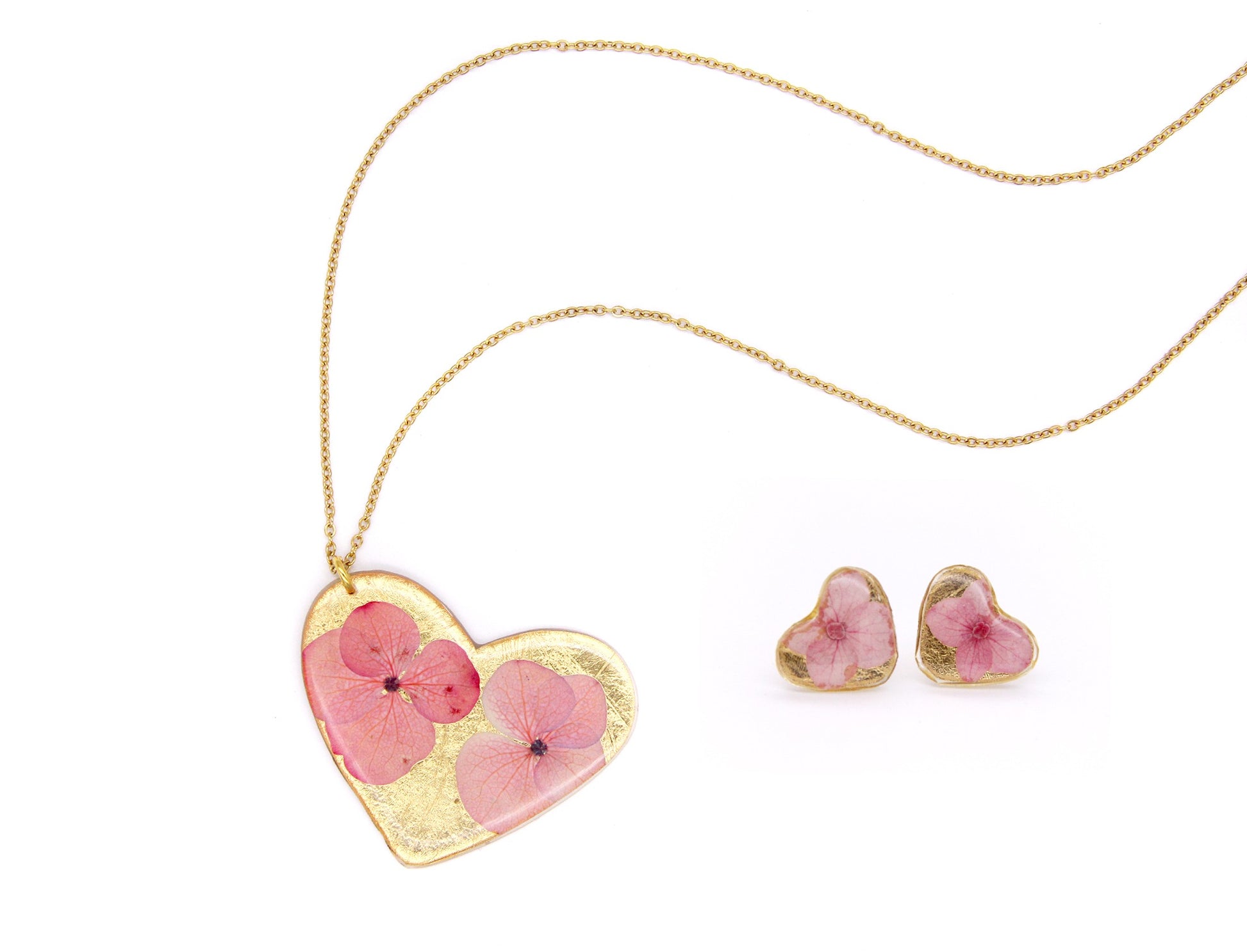 Conjunto de collar y topos de flores naturales en fondo dorado con cadena de acero quirúrgico de aproximadamente 45 cm.