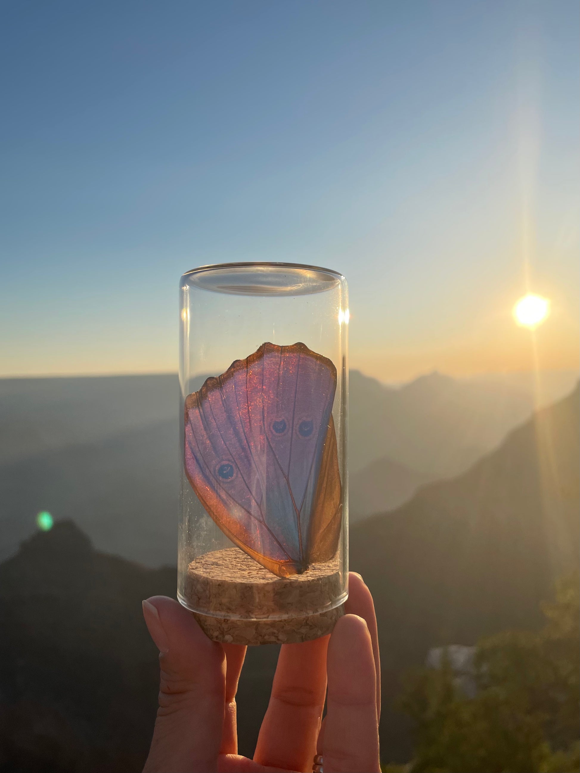 Frasco decorativo con alas de mariposa. Dimensiones de aproximadamente 10 centímetros de altura y 6 centímetros de diámetro. Está diseñado para resaltar la belleza y delicadeza de una mariposa Morpho azul.
