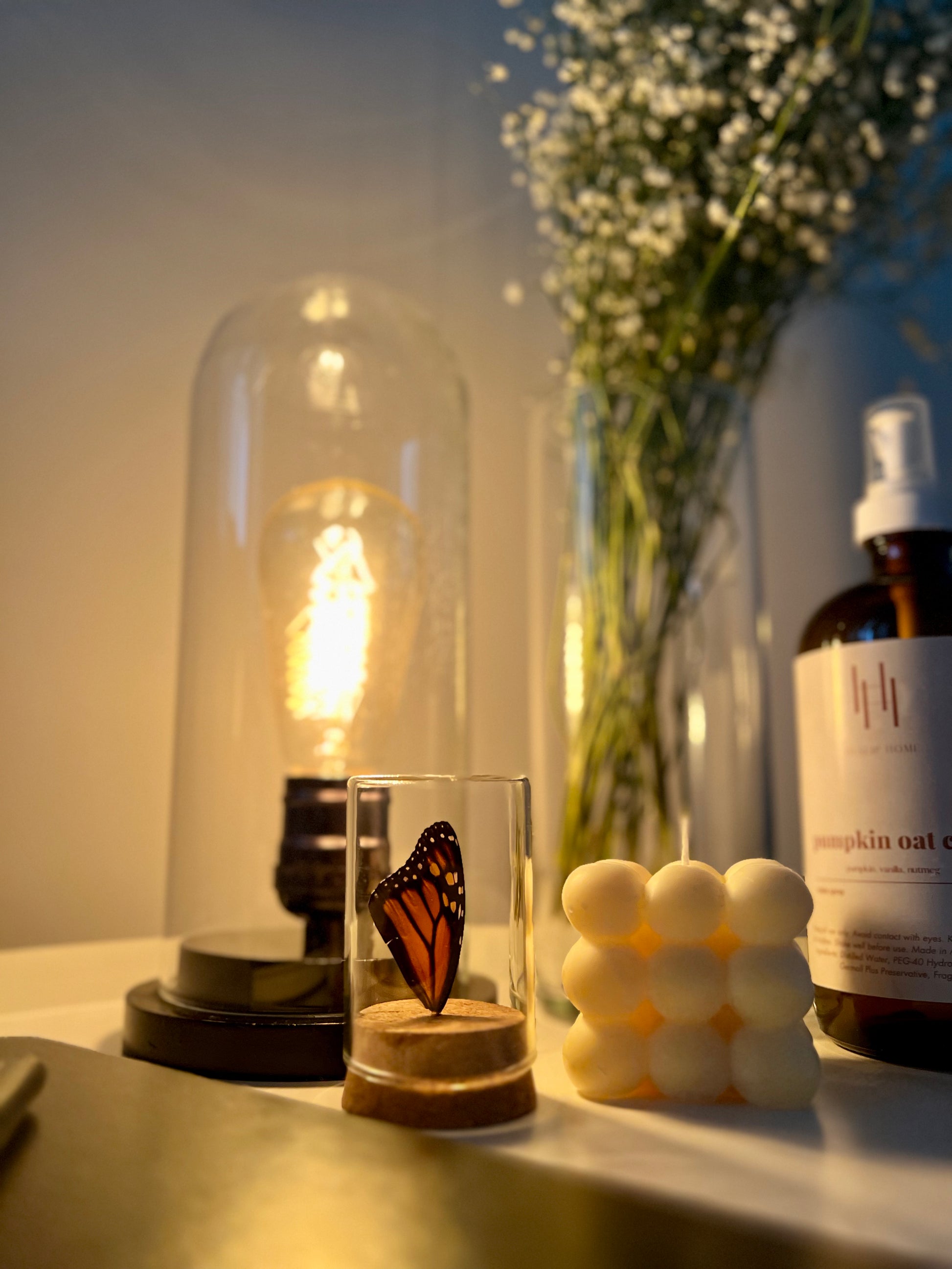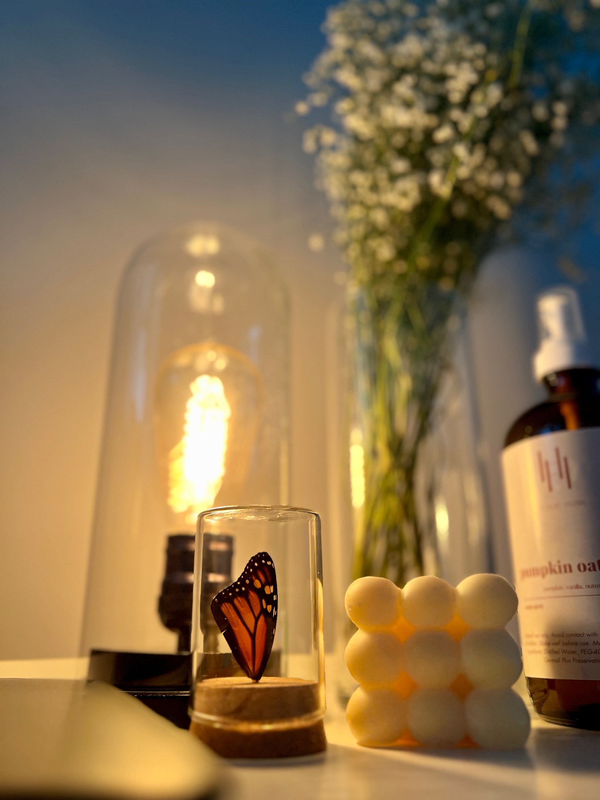 Evitar el contacto directo: Evita tocar directamente el ala de la mariposa. Siempre manipúlala sujetando el frasco por el vidrio para evitar dañarla o desplazarla de su posición.