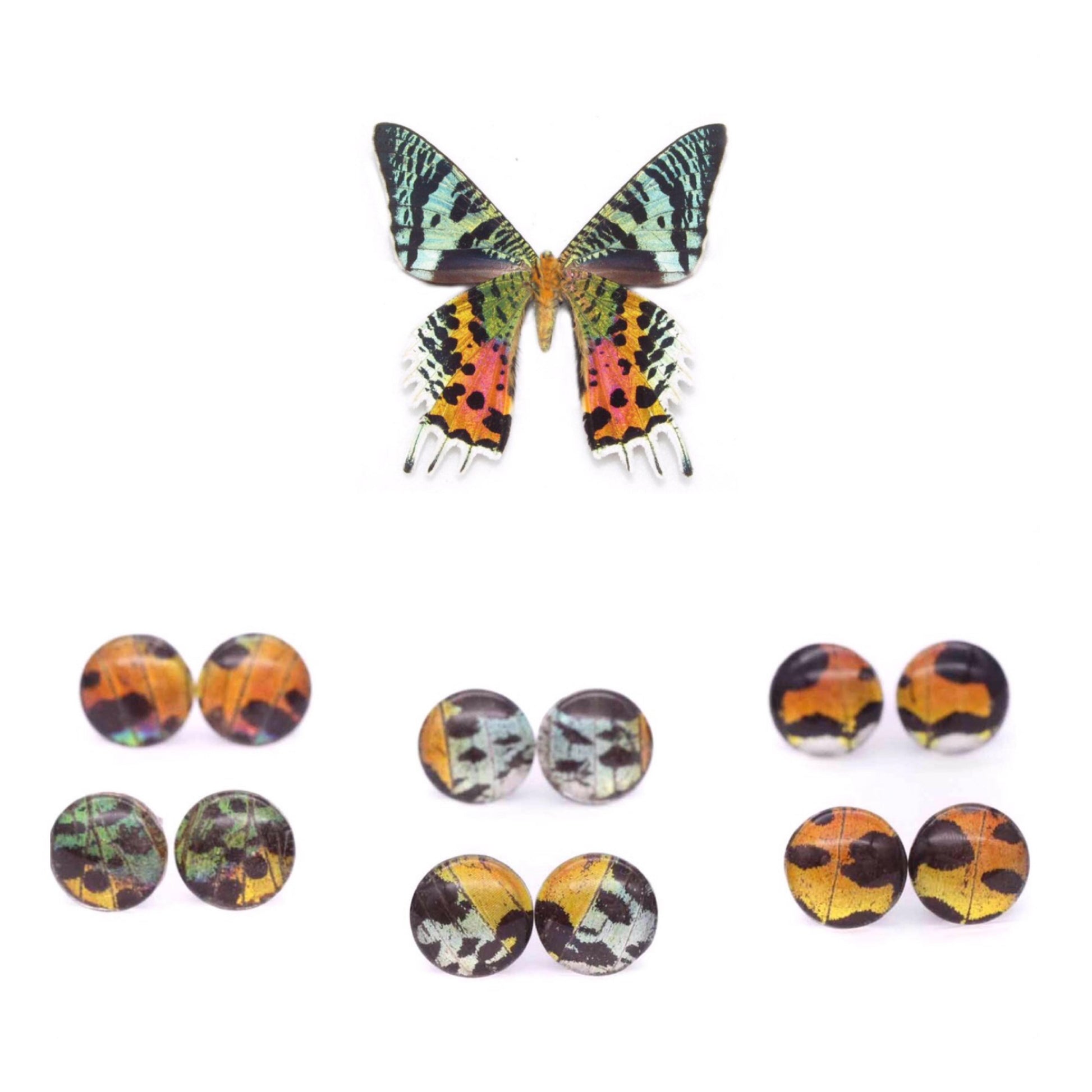 Topos elaborados en vidrio con alas inferiores de Urania ripheus de Madagascar. Pin hipoalergénico de acero, también disponibles con pin plástico.