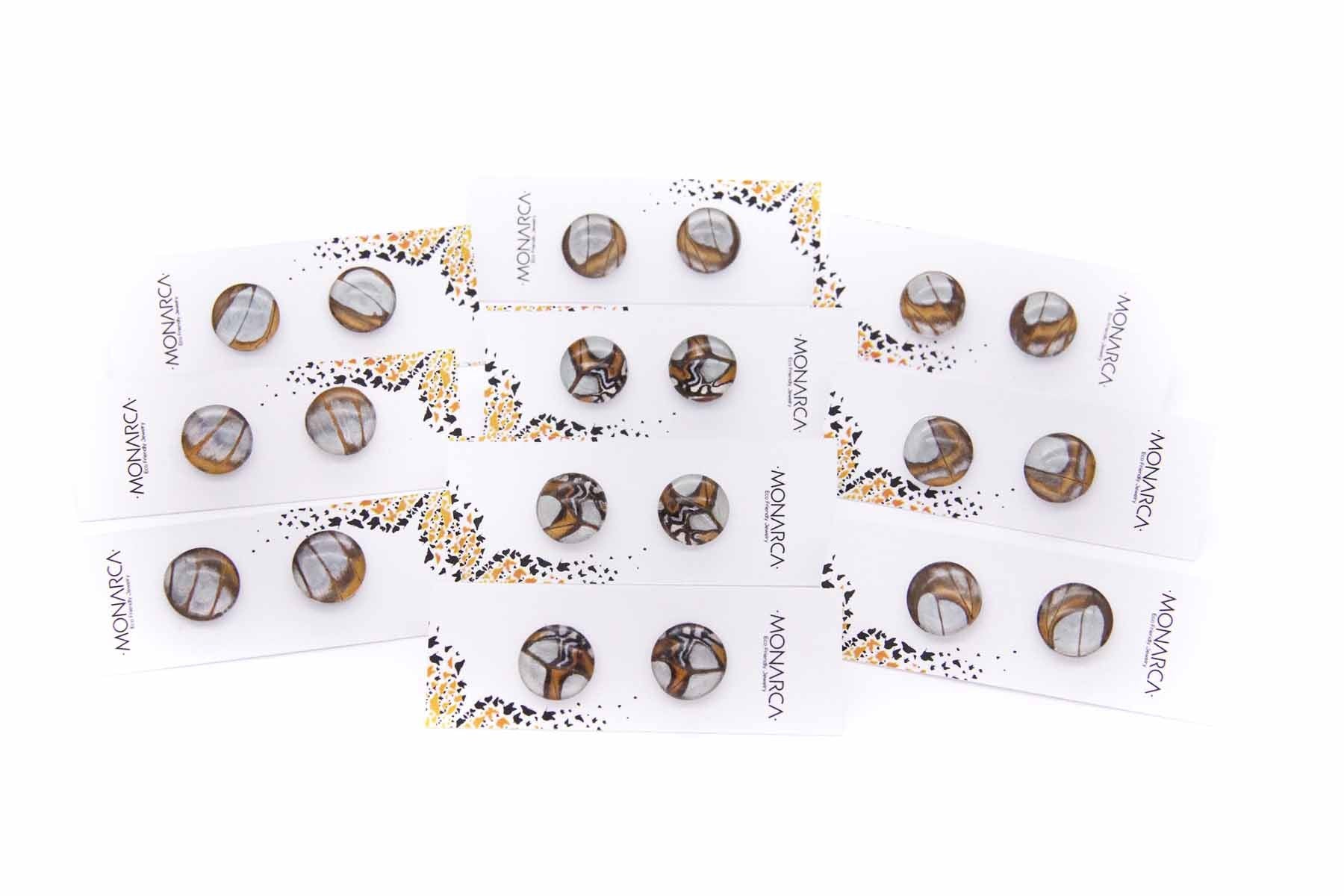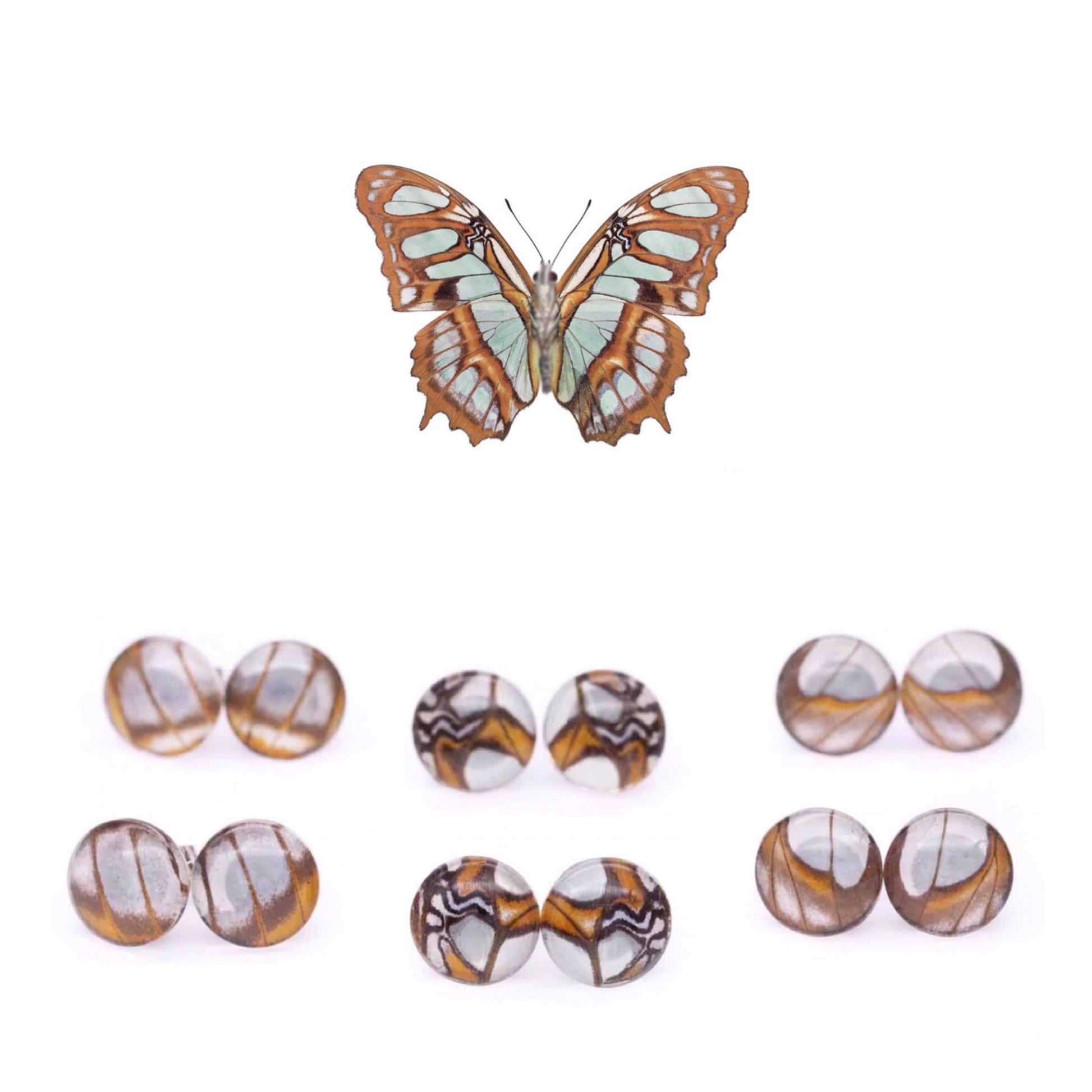 Topos elaborados en vidrio con alas de mariposa «Malaquita» Victorina stelenes. Pin hipoalergénico de acero, también disponibles con pin plástico.