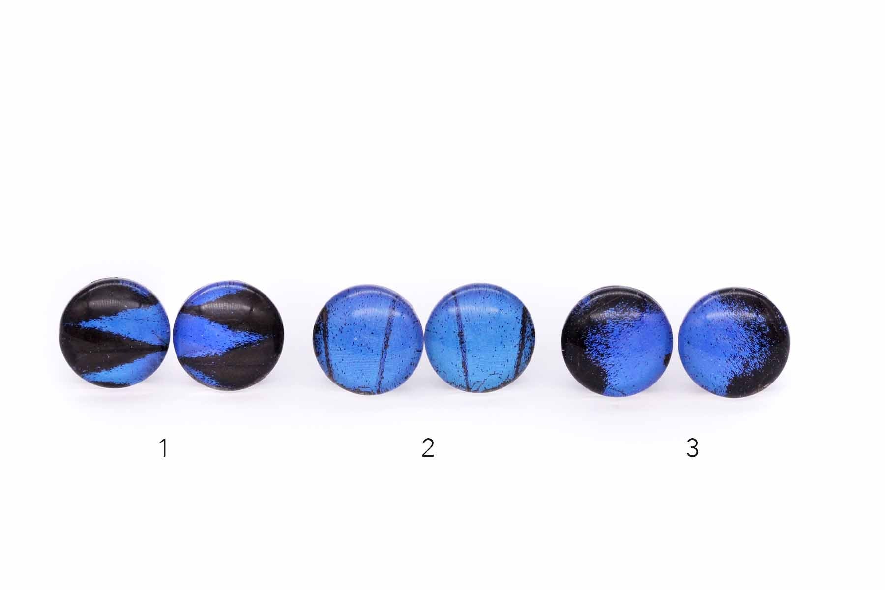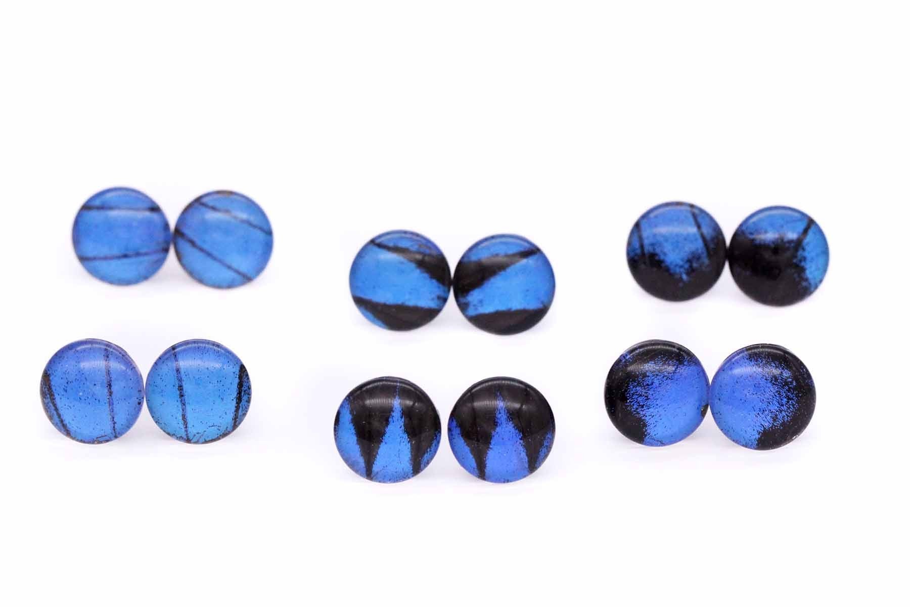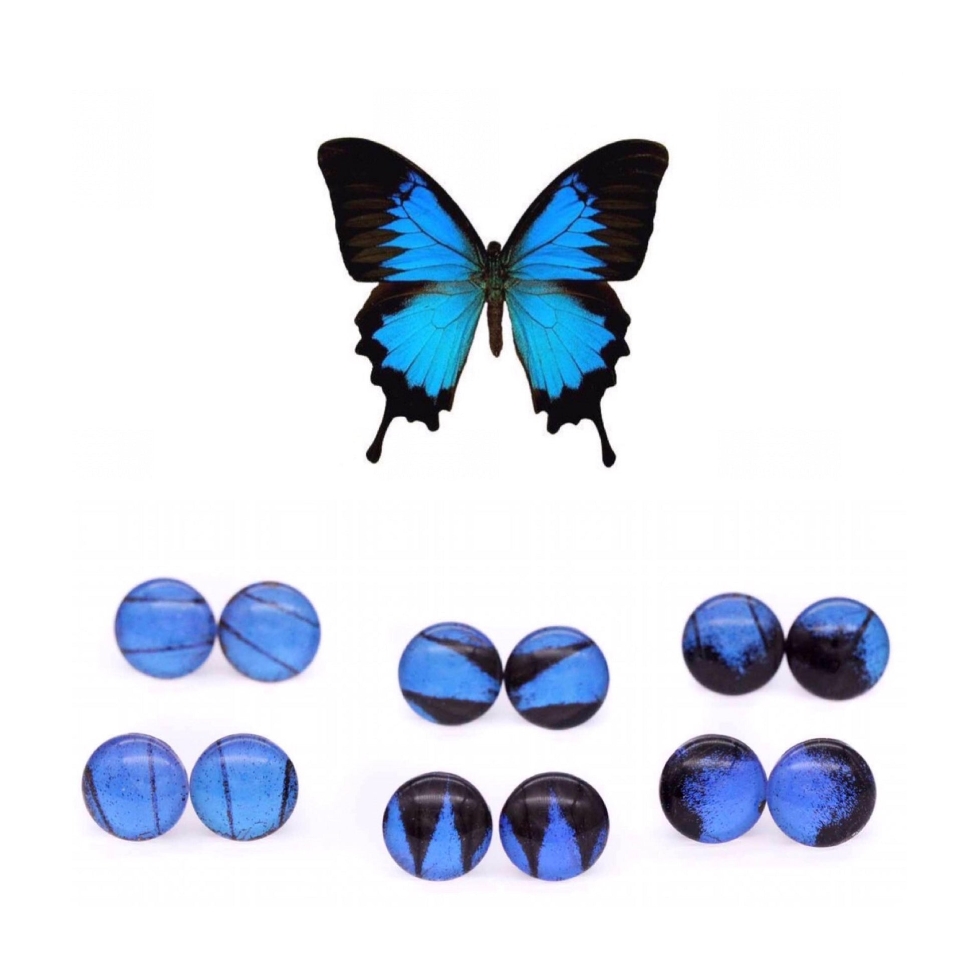 Topos elaborados en vidrio con alas de mariposa Papilio ulysses. Pin hipoalergénico de acero.