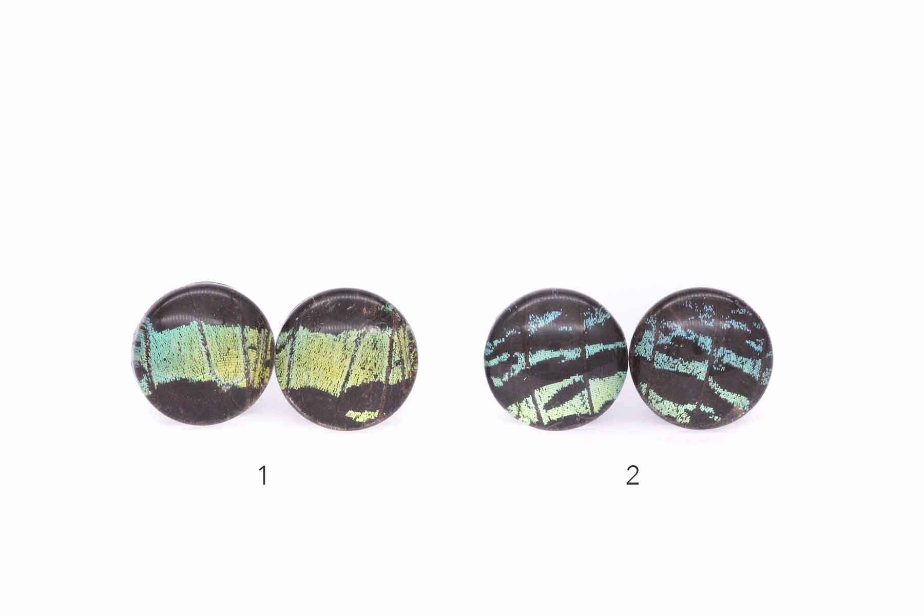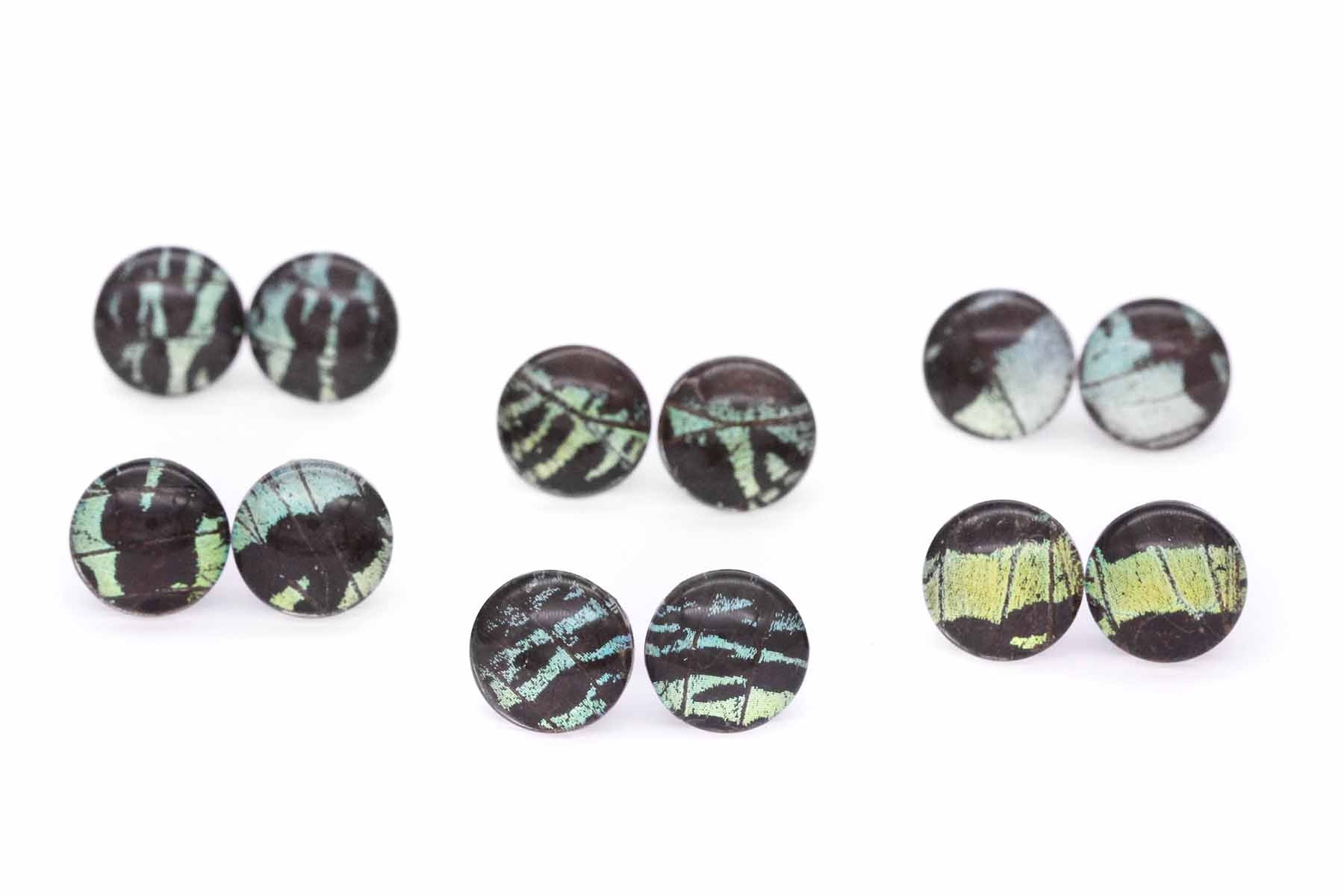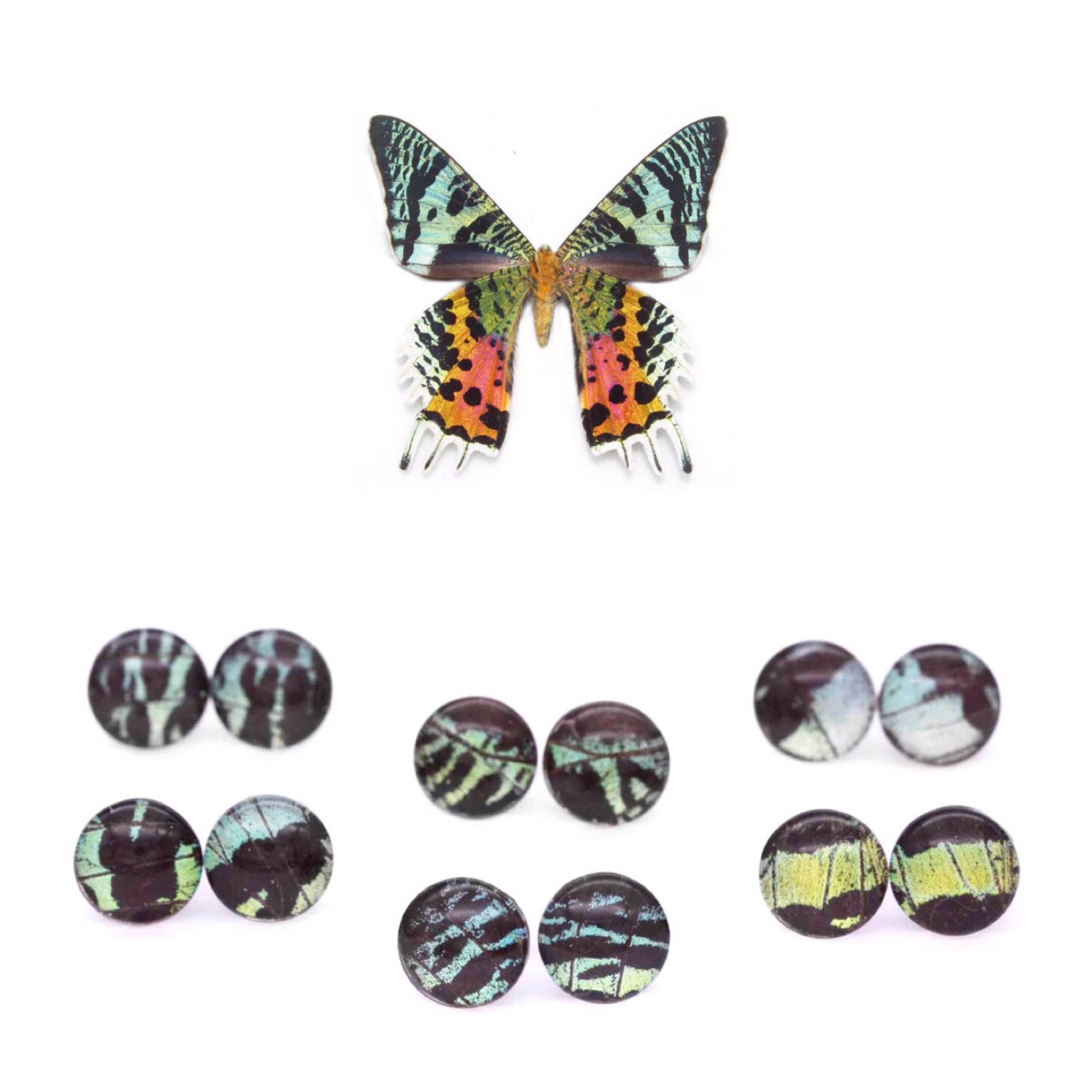 Topos elaborados en vidrio con alas superiores de Urania ripheus de Madagascar. Pin hipoalergénico de acero, también disponibles con pin plástico.